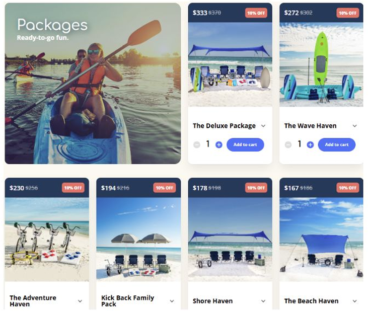 VayKLife offers a wide range of beach gear including beach chairs, carts, umbrellas, and skim/body boards. If you have a larger group, you can order additional items beyond your credit and pay the difference.